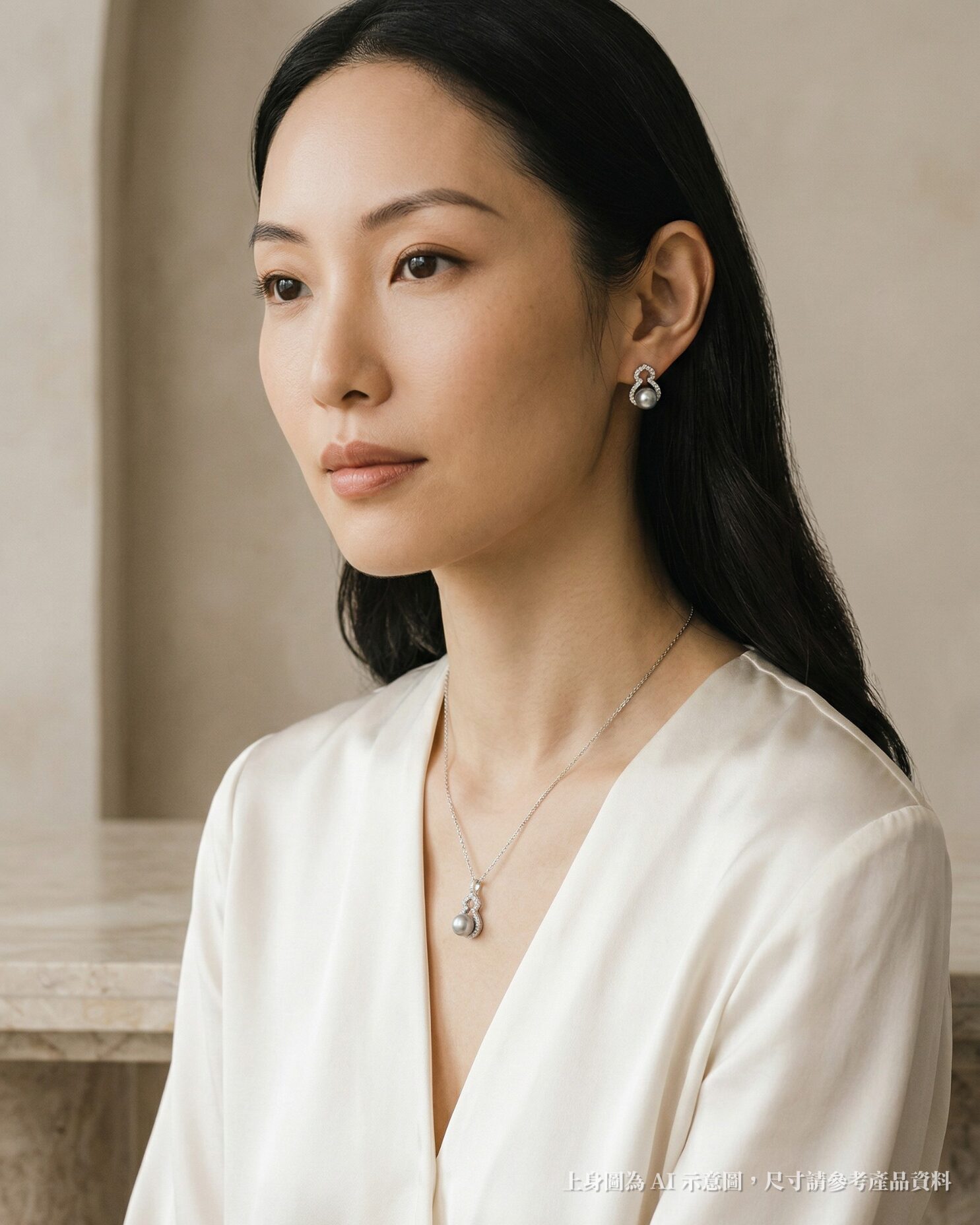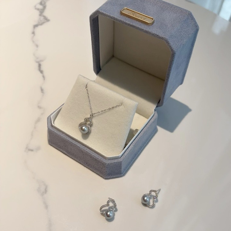 主石採用約6–7mm AKOYA海水珍珠,配上莫桑石點綴,整體設計細緻耐看,低調中帶點柔和光澤感。頸鏈長約18吋,頸鏈及耳環均採用925純銀材質,佩戴起來更顯精緻氣質。這款套裝簡約大方,無論自用或送禮都同樣合適。