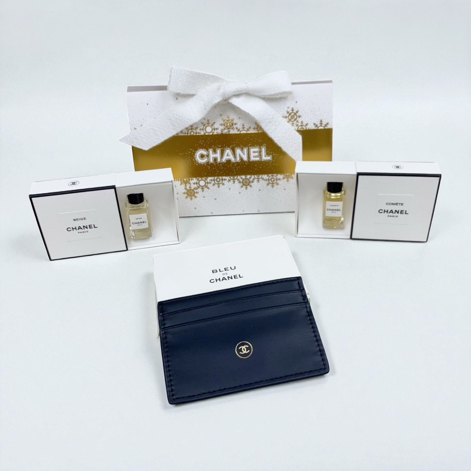 套裝內容包括: ・Chanel Beauty 最新款卡包(約 10 × 7cm) 可放約 7–8 張卡,為購買指定 BLEU DE CHANEL L’EXCLUSIF 原價 HK$1,935/100ml 之贈品 ・Chanel EAU DE PARFUM 4ml(味道隨機一款) ・限定 Chanel 禮物紙袋