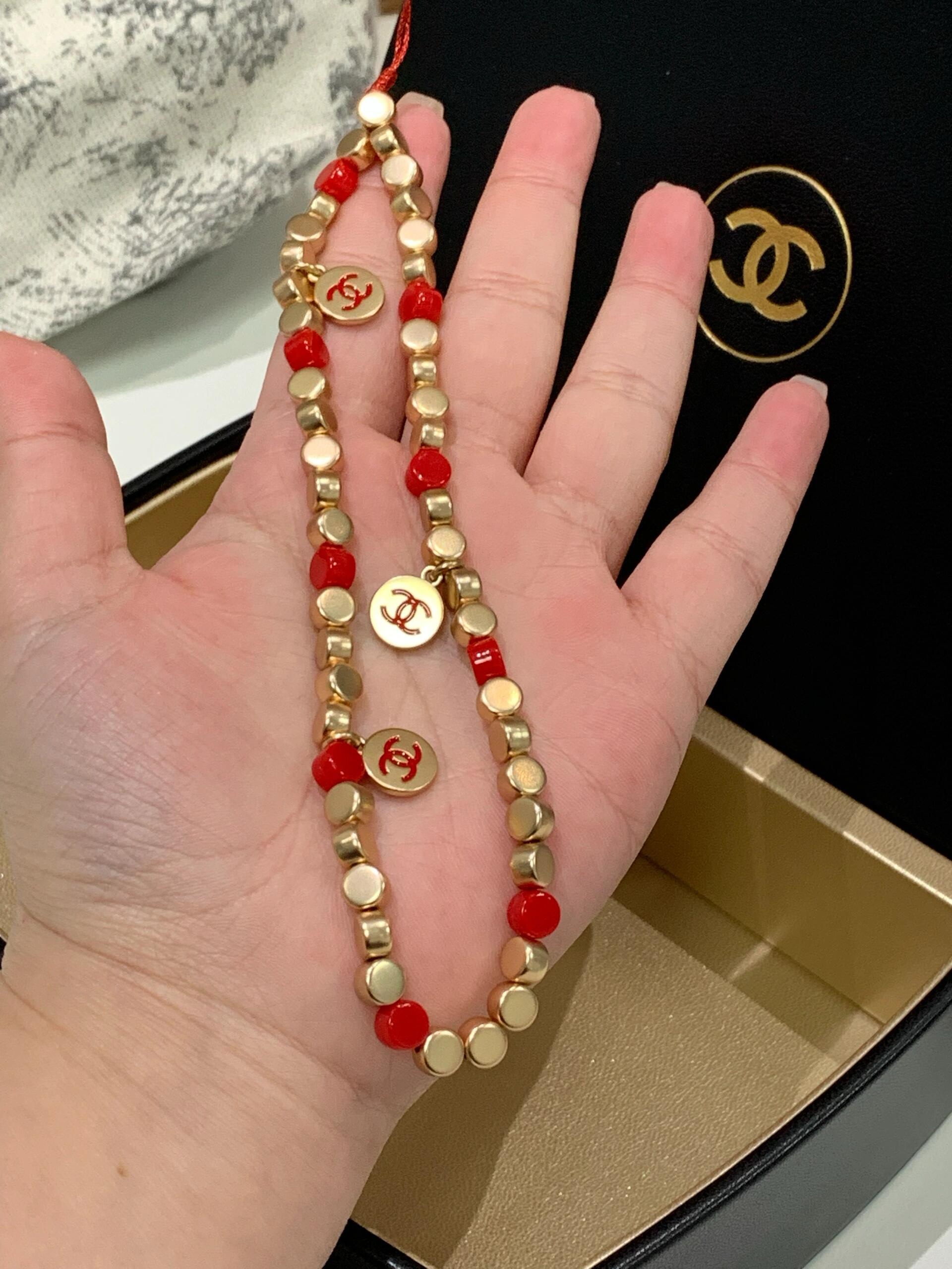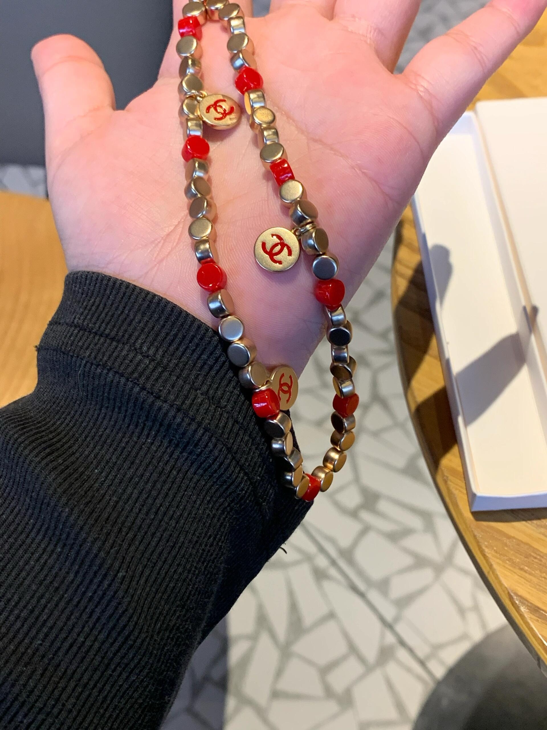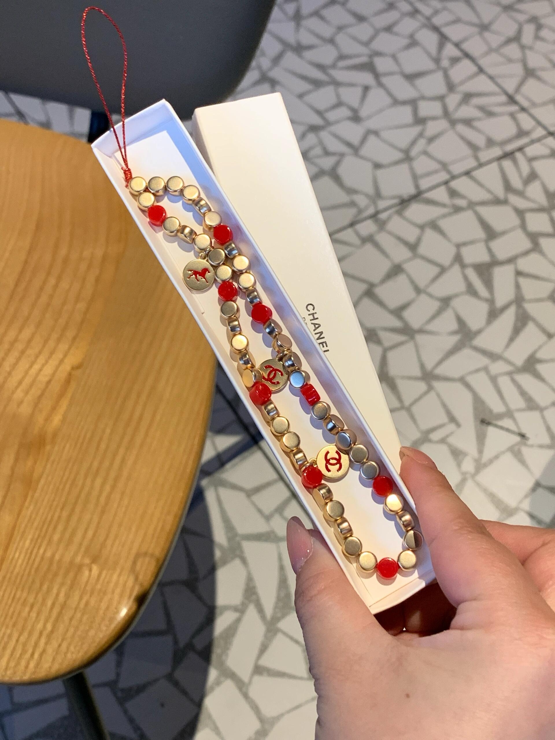 設計用咗紅色同金色做主調,紅珠配啞金色小圓珠,中間點綴幾個雙 C logo 圓牌,好顯白又好有賀年感,影相好出鏡。