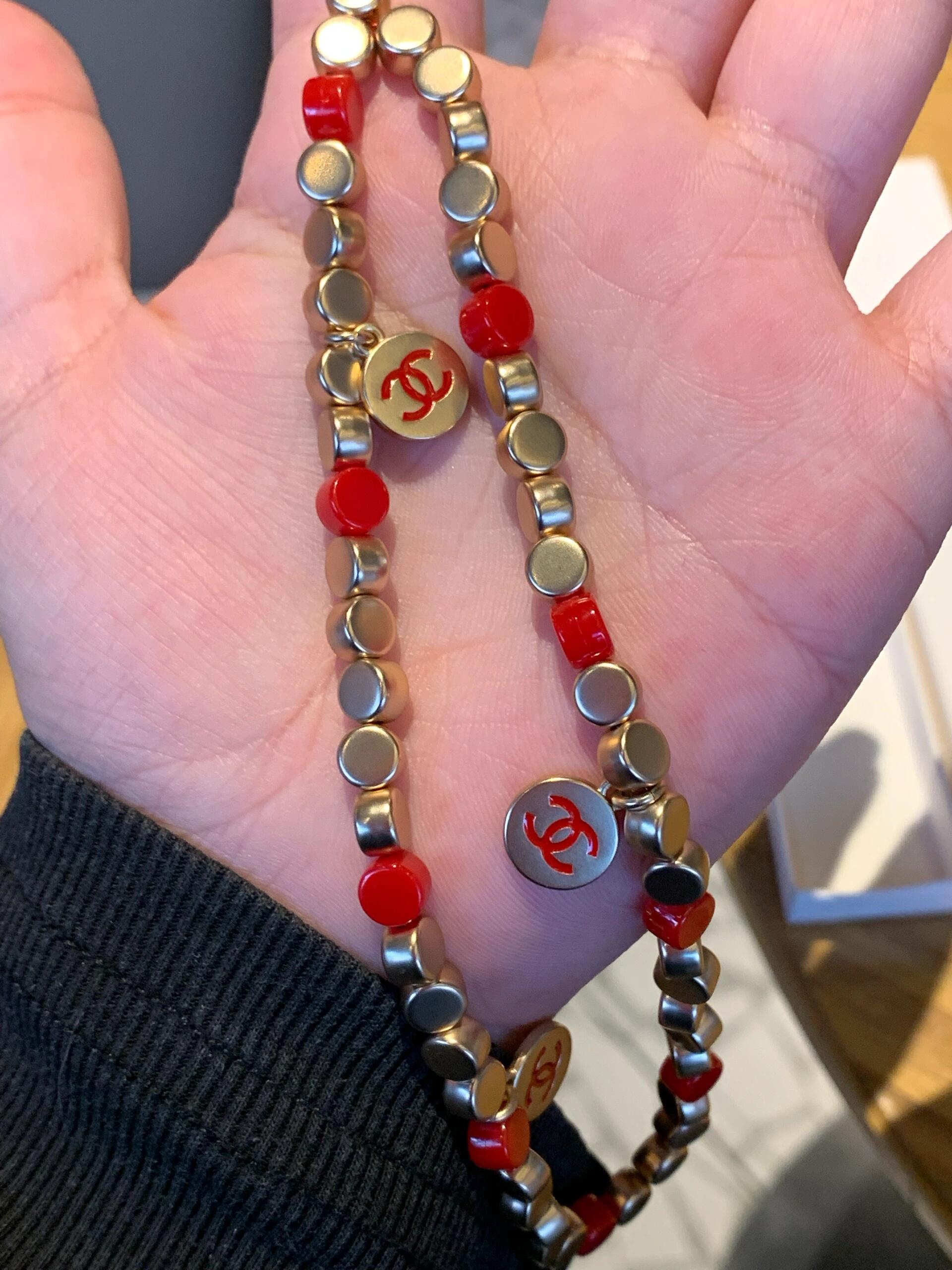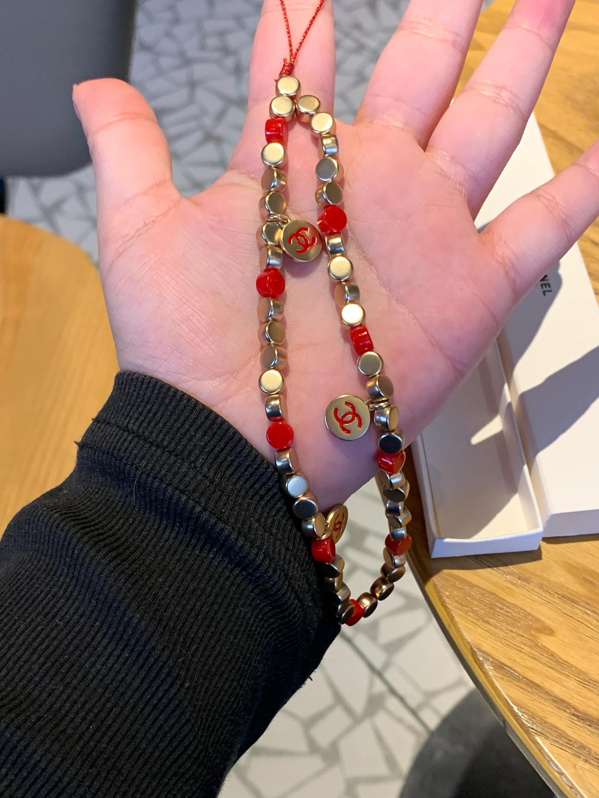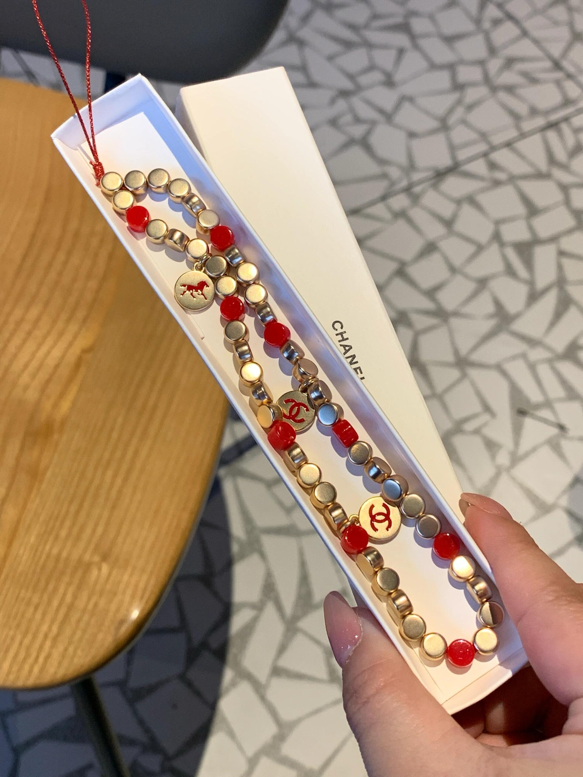 設計用咗紅色同金色做主調,紅珠配啞金色小圓珠,中間點綴幾個雙 C logo 圓牌,好顯白又好有賀年感,影相好出鏡。
