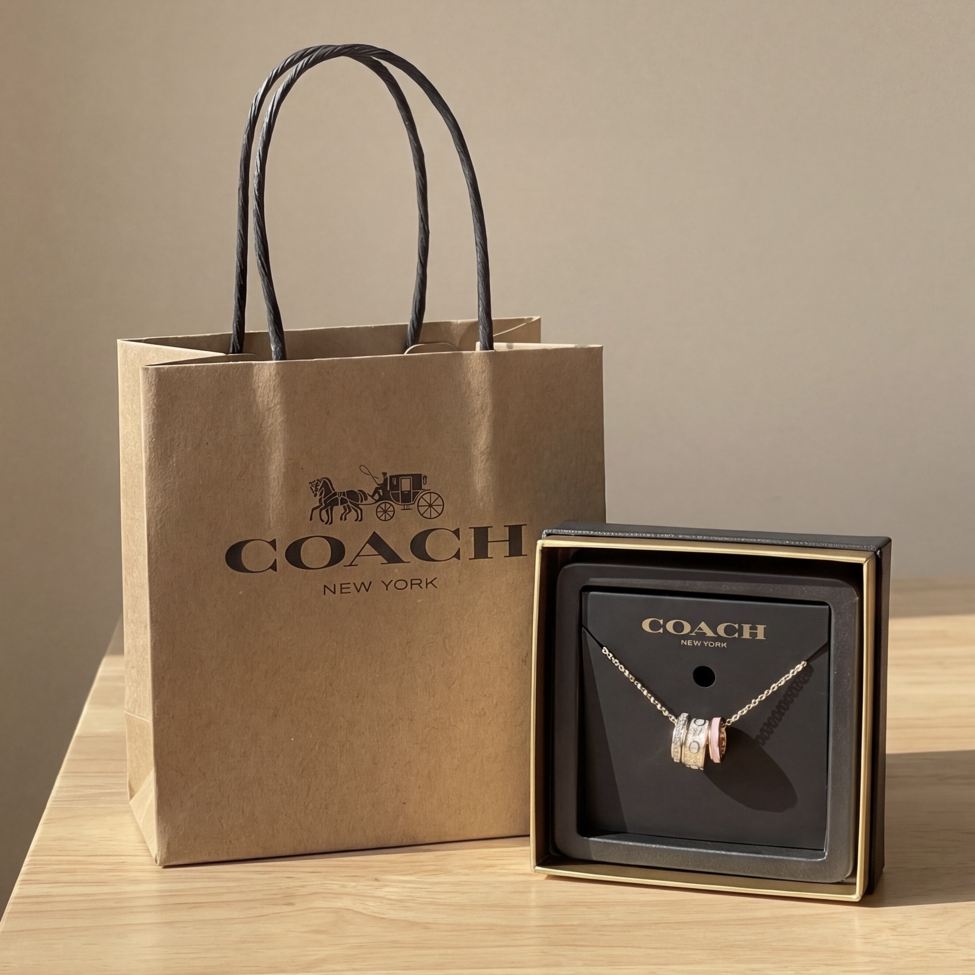 Coach 粉白三環吊墜項鏈