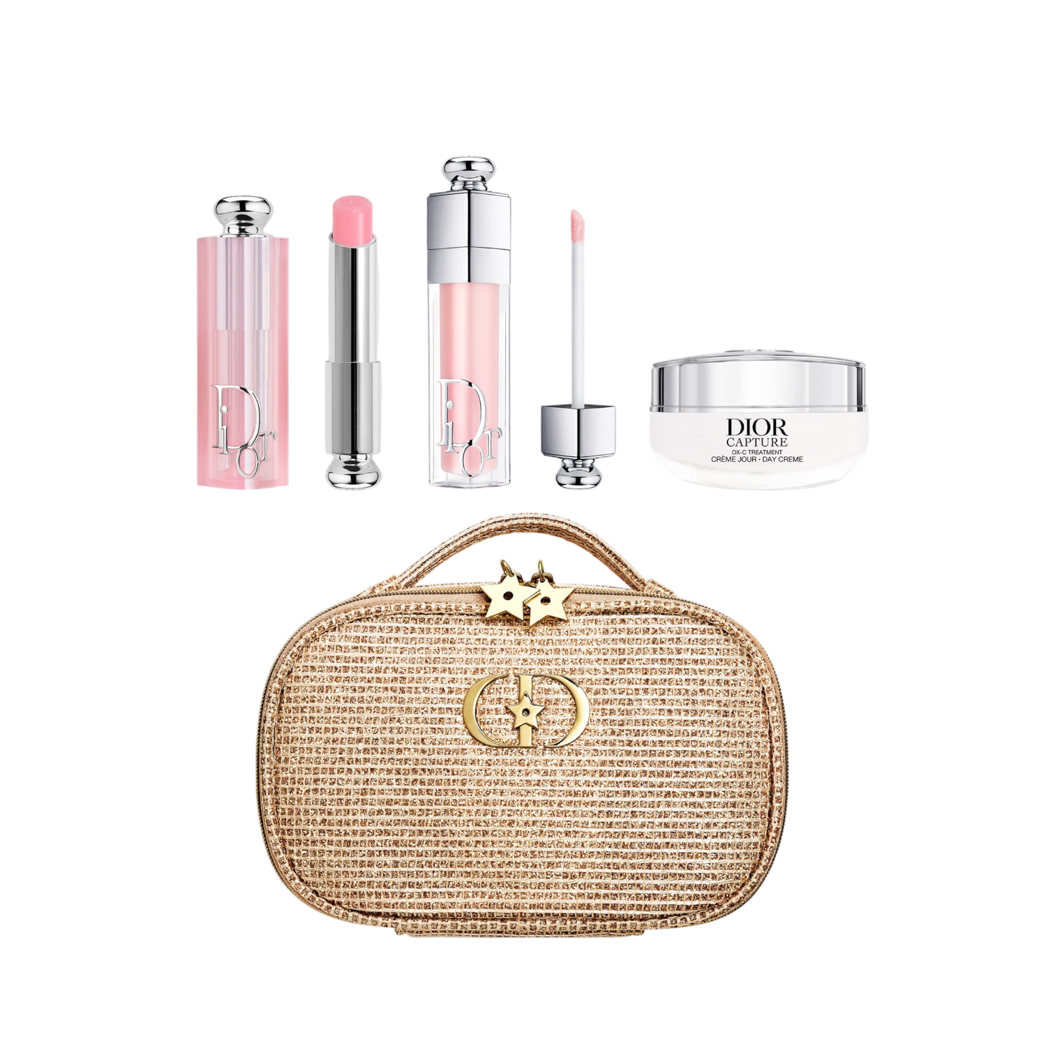 套裝包括:Dior Addict Lip Glow 001 Pink 潤色護唇膏 3.2g、Dior Addict Lip Maximizer 001 Pink 豐盈唇彩 6ml,以及 Capture Totale 日霜旅行裝 15ml(具補水緊緻功效),配以金色編織化妝包,兼具實用與收藏價值。